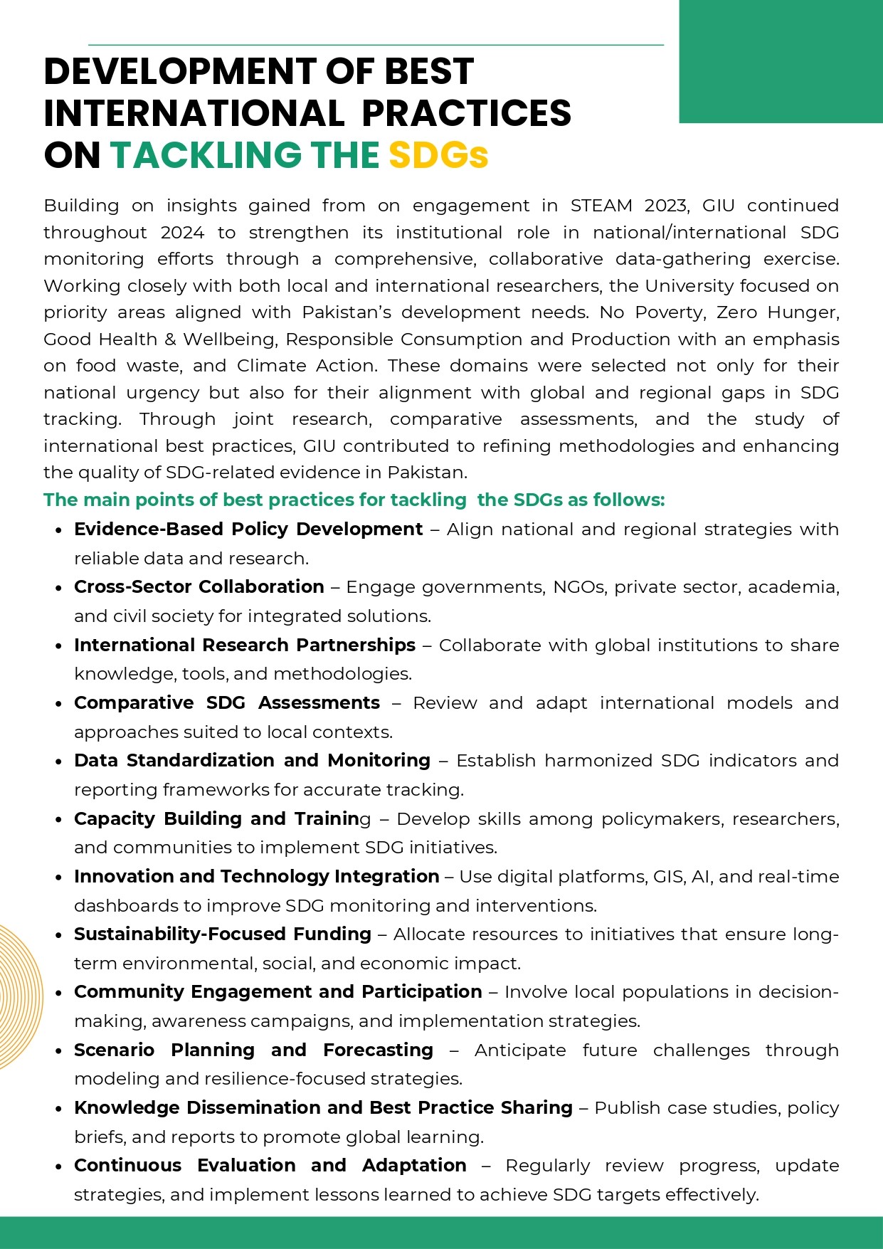 Further in 2024, University expanded its international footprint by forging strategic partnerships and engaging in global SDG initiatives. During the STEAM Conference 2024 – Lahore Round, hosted at the GIU, international researchers and partners took part in dedicated review and benchmarking sessions, where global sustainability models were compared, evaluated, and the direct outcome of these sessions was the work of refined international best-practice frameworks on tackling the SDGs.